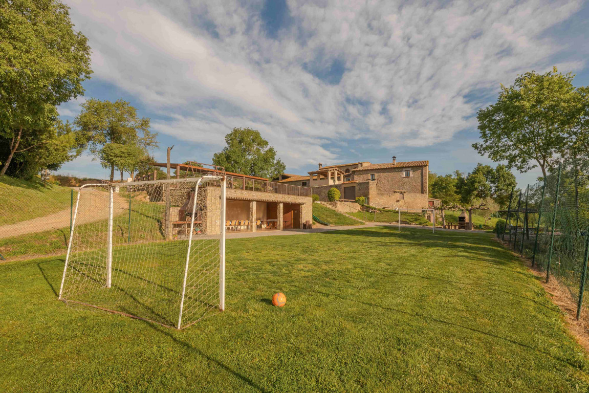 La zona exterior la forma un gran jardí de més de 2.000 m2 amb un gran porxo amb barbacoa equipat amb una petita nevera, rentaplats i lavabo, on poder dinar tots junts. Una piscina amb tanca, de 8 x 4 m d’ús exclusiu per als hostes, un petit estany amb oques, zona de futbol amb dues porteries, gronxadors, tobogan, taula de ping-pong. La casa disposa d’un espai ampli també per a pàrquing.