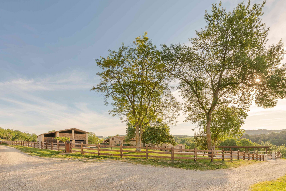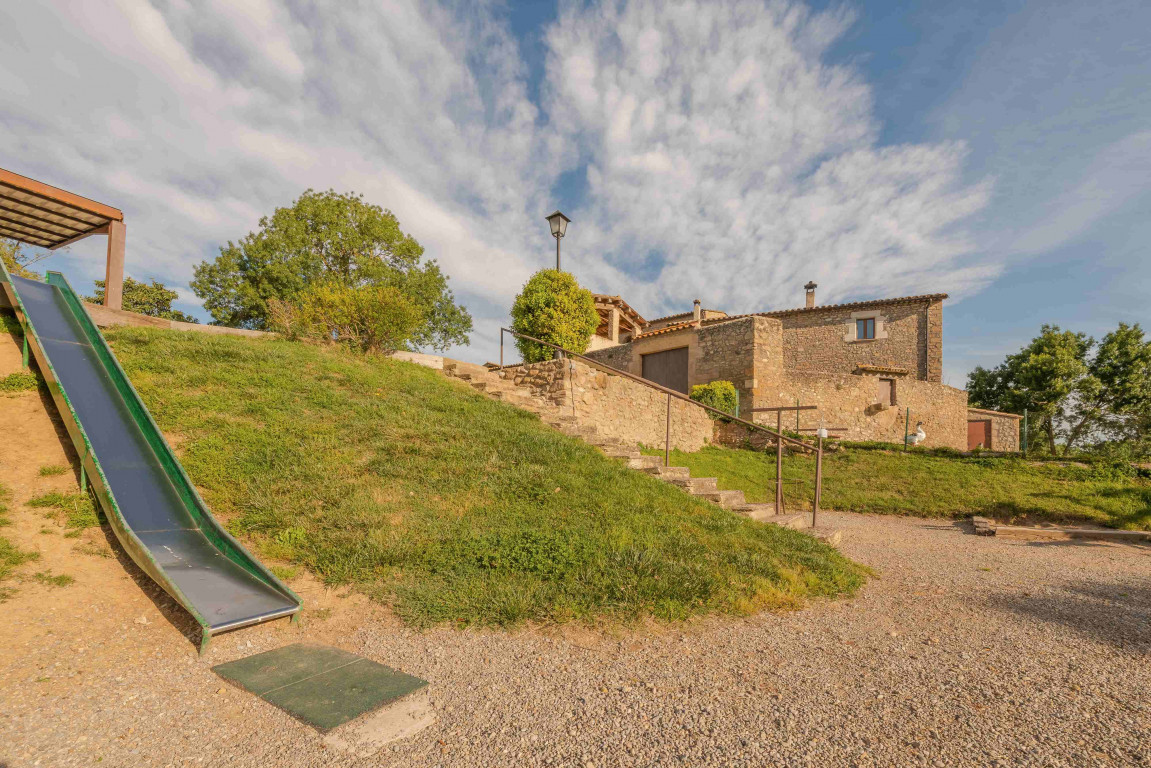 La zona exterior la forma un gran jardí de més de 2.000 m2 amb un gran porxo amb barbacoa equipat amb una petita nevera, rentaplats i lavabo, on poder dinar tots junts. Una piscina amb tanca, de 8 x 4 m d’ús exclusiu per als hostes, un petit estany amb oques, zona de futbol amb dues porteries, gronxadors, tobogan, taula de ping-pong. La casa disposa d’un espai ampli també per a pàrquing.